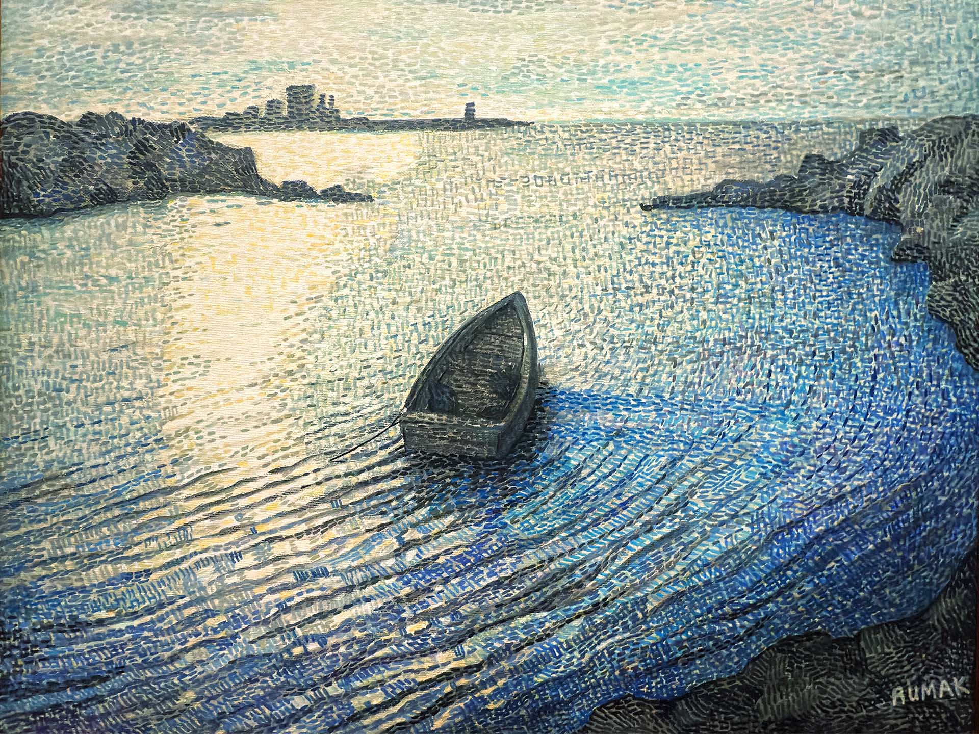 Anna Rumak, Marina con barca, olio su tela, 40 x 50