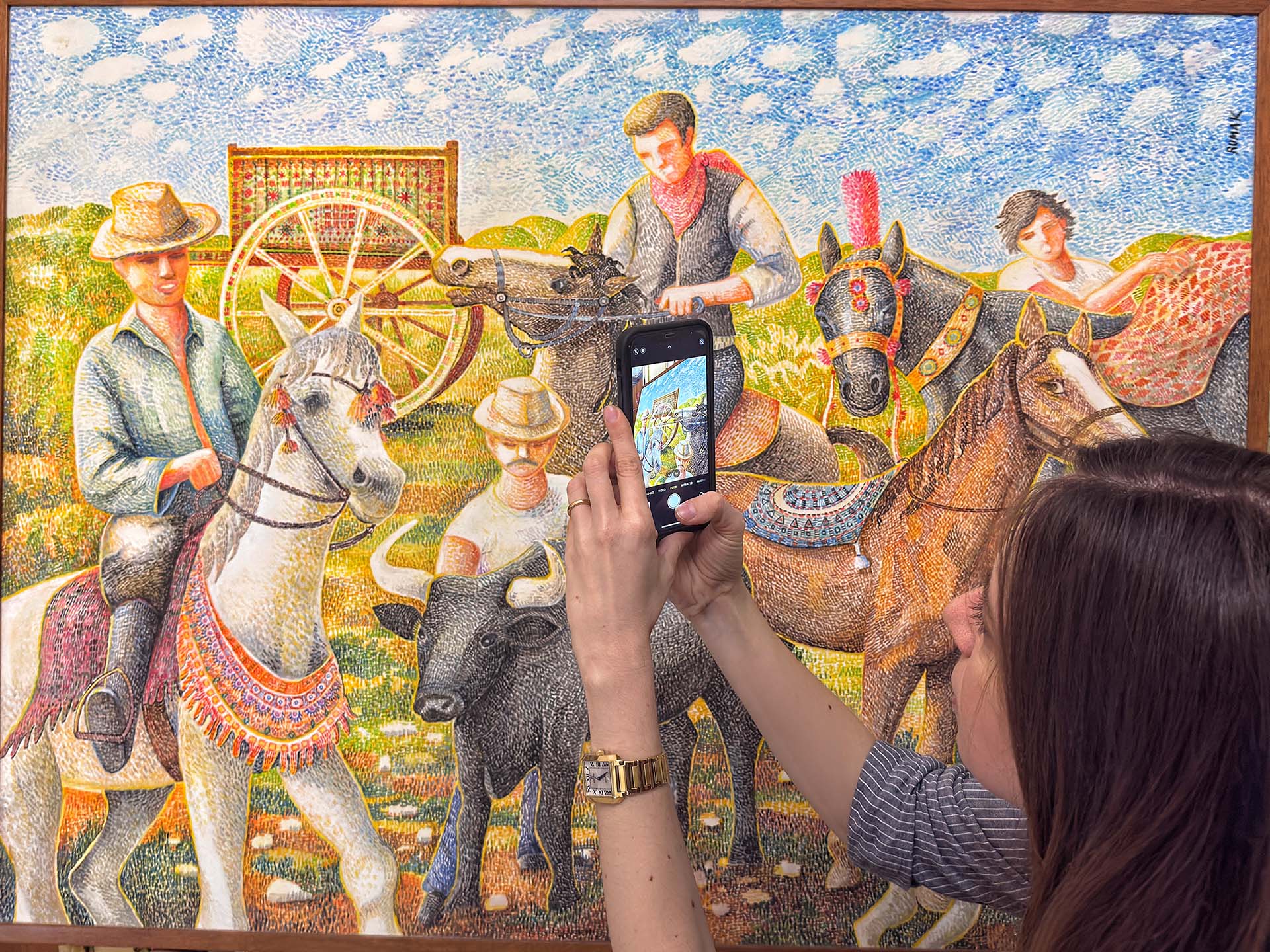 «Senz’altro il puntinismo. Non sapevo nemmeno che esistesse. Solo dopo, informandomi, ho scoperto che già esisteva: il puntinismo di Seurat e Signac, e dei grandi impressionisti francesi. A me la pennellata molto larga non diceva nulla, non mi aiutava a tirare fuori le emozioni che volevo esprimere. Così, anno dopo anno, è diventata sempre più corta, fino a quando le macchie sono diventate dei punti e questa è stata la meraviglia, il miracolo, mi sono ritrovata! Come se avessi capito che la mia anima ha tanti colori, tante forme e cambia giorno dopo giorno. Oggi sono in un modo, domani magari il sentimento è cambiato, posso cambiare. E spero in meglio. Tutti questi puntini fanno parte della vastità di sentimenti della mia anima.»
