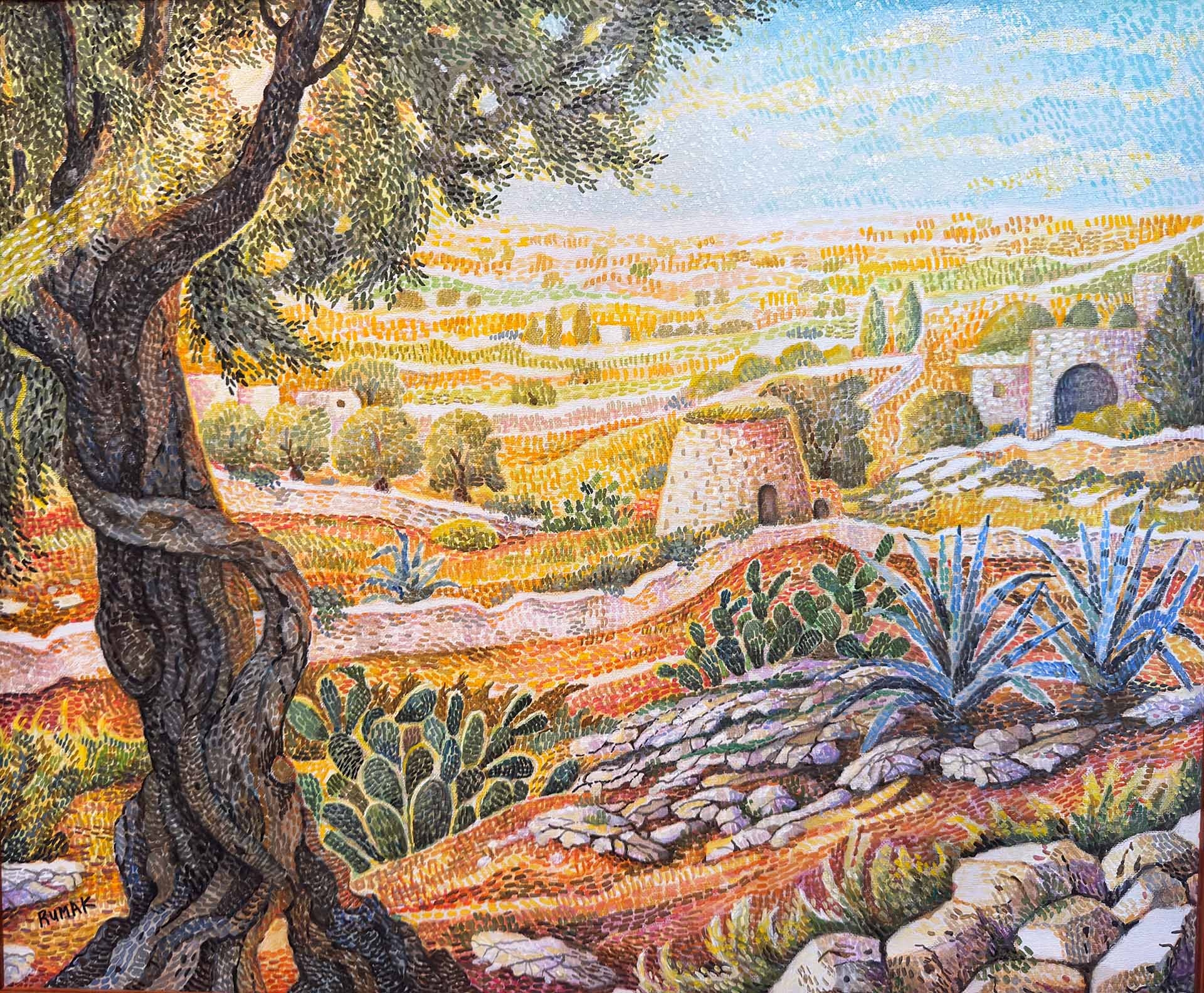 Anna Rumak, Campagna salentina con ulivo e agavi, olio su tela, 50 x 60