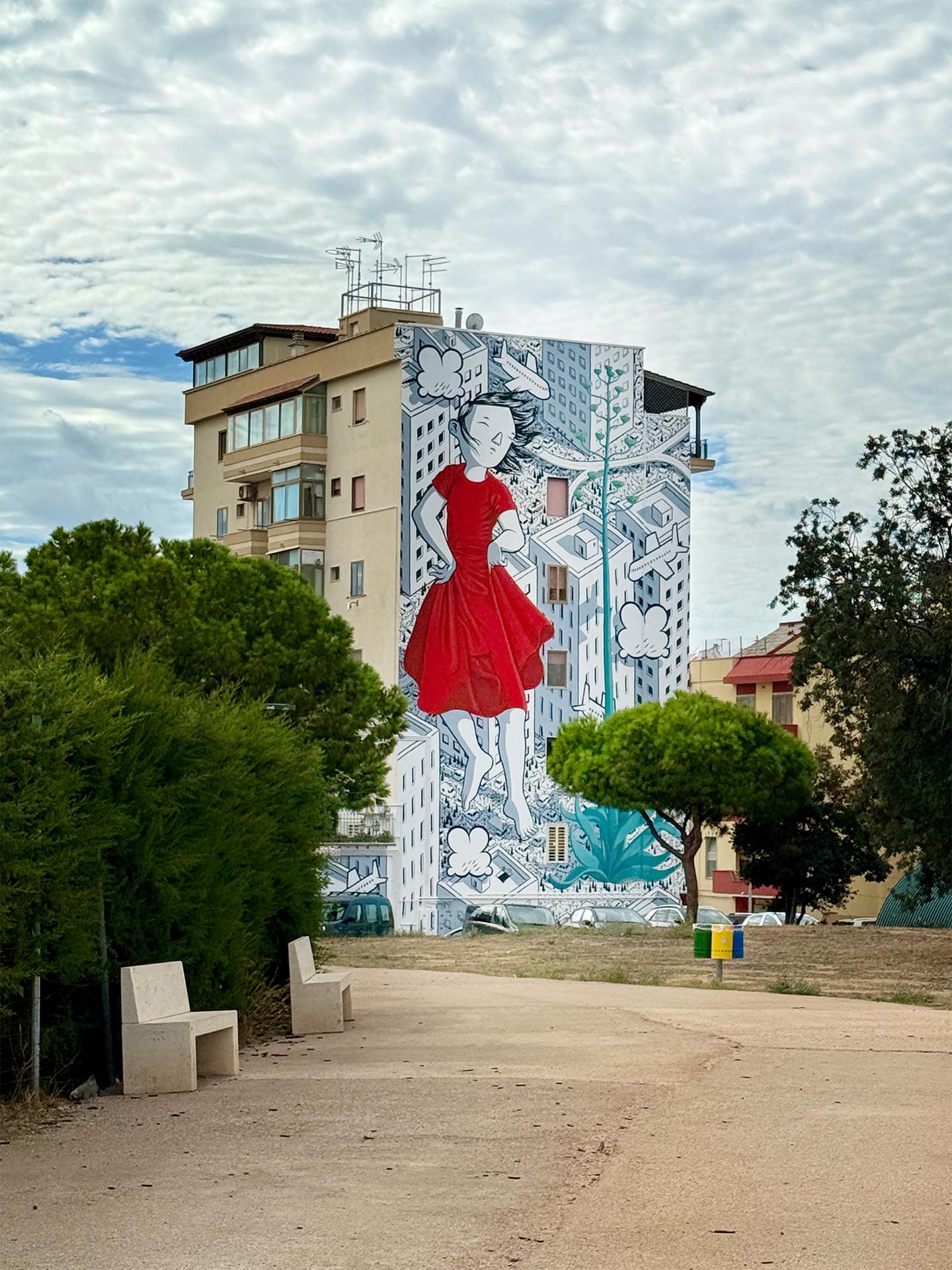 Per visitarlo basta parcheggiare in viale Europa e lasciarsi guidare… dai murales! Spiccano coloratissimi sulle fiancate delle palazzine bianche e beige, lasciando a bocca aperta visitatori e passanti e imponendosi con una naturalezza disarmante come punti di riferimento e spunti di riflessione.